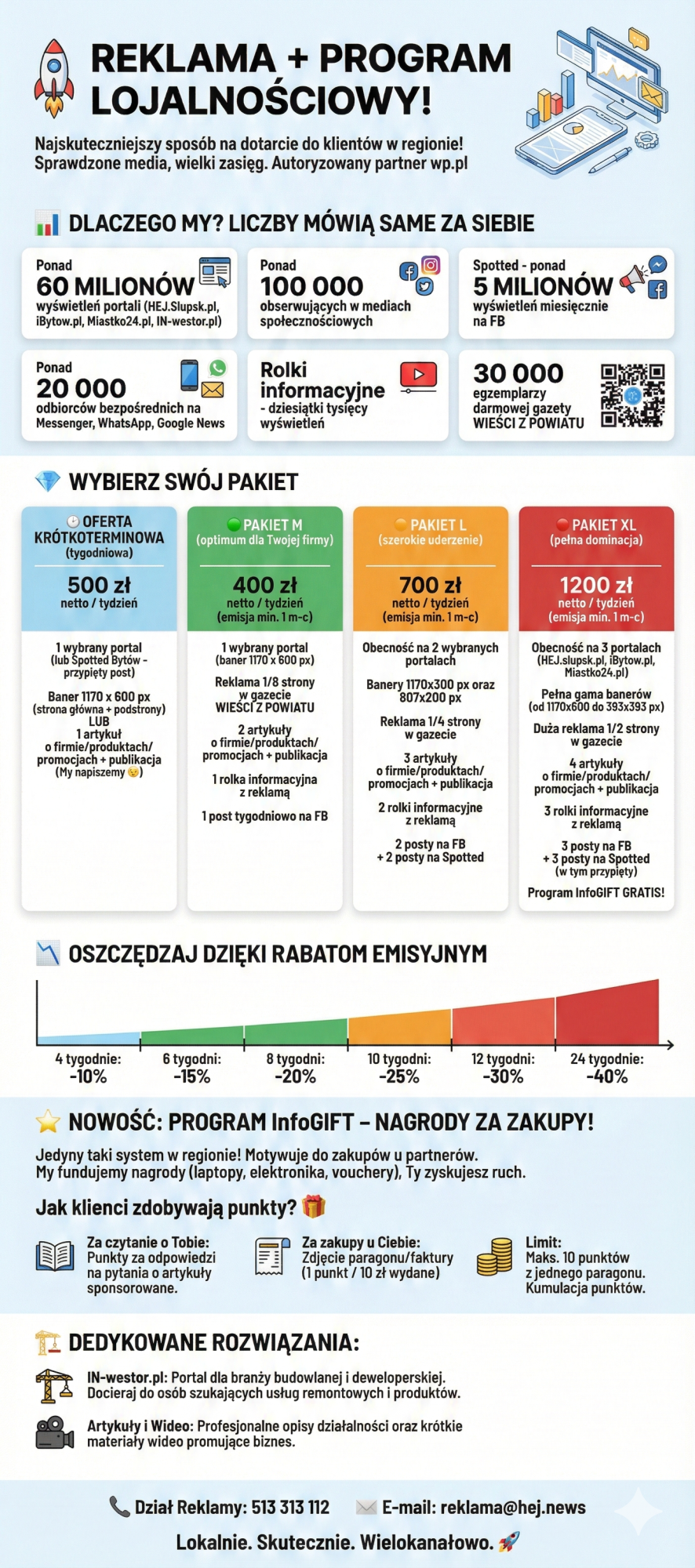 Oprócz artykułów oferujemy szerokie możliwości promocji wizualnej, w tym w naszej gazecie papierowej oraz nagrania wideo. Poniżej znajdziesz obraz pełnego cennika, który zawiera pakiety z banerami reklamowymi na portalach, w social mediach oraz kanałach nadawczych.